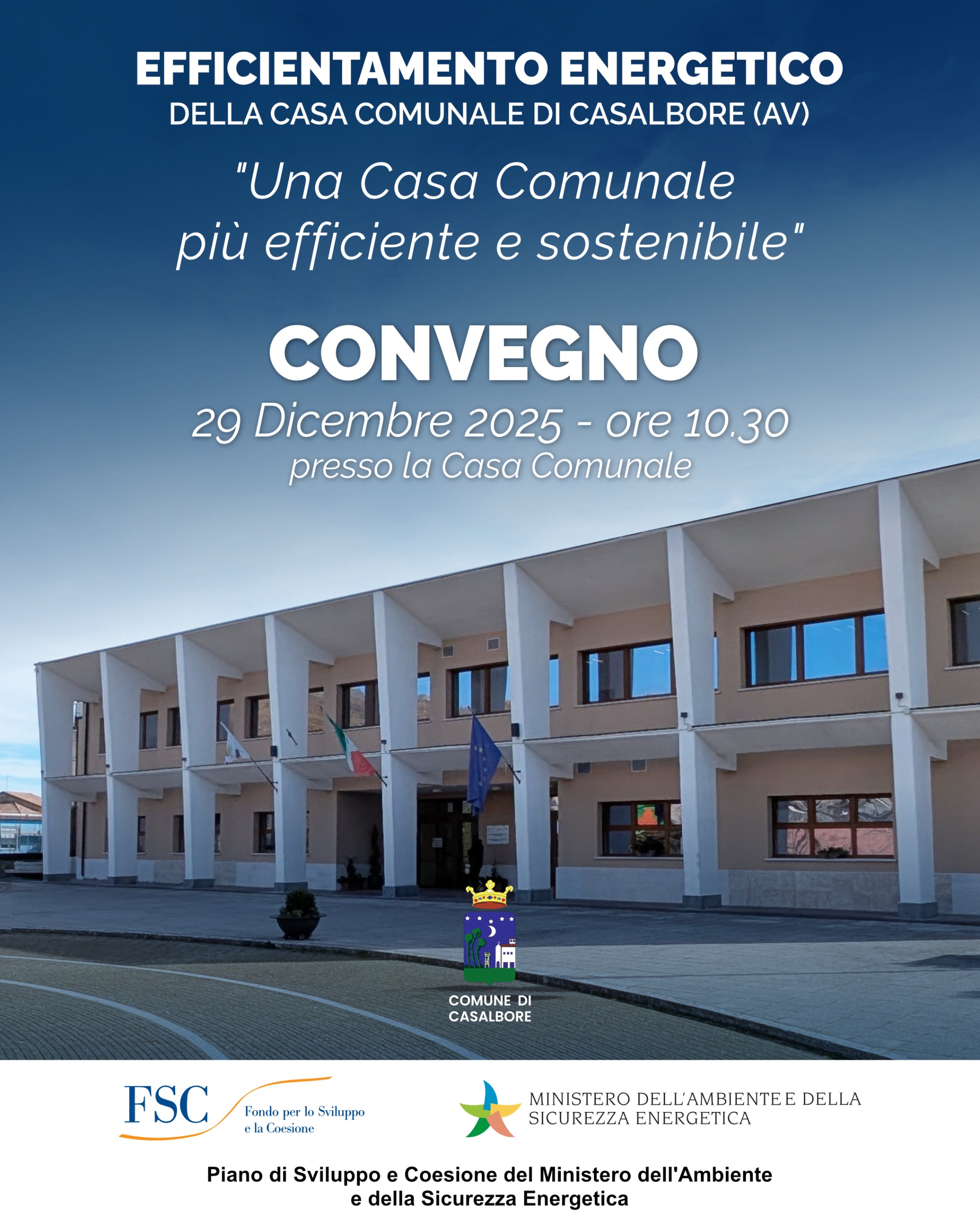 Lunedì 29 dicembre 2025, alle ore 10.30, presso la sala consiliare della Casa Comunale, si terrà un convegno informativo dedicato agli interventi di efficientamento energetico realizzati sull’edificio comunale.