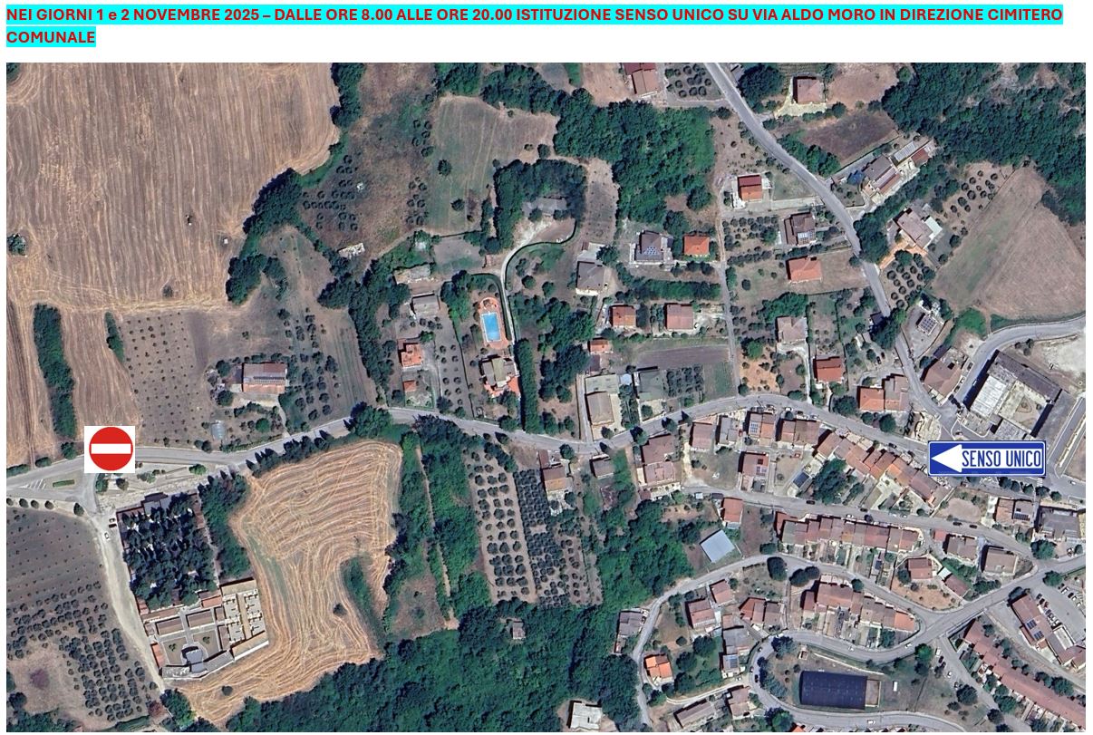 nei giorni 1 e 2 novembre 2025, dalle ore 08.00 alle ore 20.00 - ISTITUZIONE SENSO UNICO DI MARCIA SU VIA ALDO MORO IN DIREZIONE CIMITERO COMUNALE; DIVIETO DI SOSTA A TUTTE LE CATEGORIE DI VEICOLI SU AMBO I LATI DI VIA ALDO MORO; DIVIETO DI SOSTA A TUTTE LE CATEGORIE DI VEICOLI SULL'AREA ANTISTANTE L'INGRESSO DEL CIMITERO.